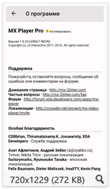 Описание: MX Player — видео/аудио -плеер для Android-смартфонов и планшетов. Плеер отличается удобной системой управления. Так, для изменения громкости достаточно провести пальцем вверх или вниз по правому краю экрана, для изменения яркости картинки - слева. Скольжение вправо или влево отвечает за перемотку позиции воспроизведения. С помощью MX Player вы можете изменять пропорции и размер картинки. Привычный жест растягивания или сжатия увеличит или уменьшит изображение на экране, а специальная кнопка в панели управления дает возможность переключаться между режимами отображения. Кроме этого плеер поддерживает работу с субтитрами, при чем имеется возможность гибкой настройки внешнего вида субтитров, включая выбор шрифта, его стиль, размер, цвет, тень, границу и другие параметры. Для декодирования видео можно задействовать как аппаратные, так и программные средства. MX Video Player, по заявлению разработчиков, наиболее передовой видеоплеер из всех, доступных на Android сегодня. Он воспроизводит практически все видеофайлы, в том числе .3gp .avi .divx .f4v .flv .mkv .mp4 .mpeg .mov .vob .wmv .webm .xvid и прочие.