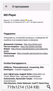 Описание: MX Player — видео/аудио -плеер для Android-смартфонов и планшетов. Плеер отличается удобной системой управления. Так, для изменения громкости достаточно провести пальцем вверх или вниз по правому краю экрана, для изменения яркости картинки - слева. Скольжение вправо или влево отвечает за перемотку позиции воспроизведения. С помощью MX Player вы можете изменять пропорции и размер картинки. Привычный жест растягивания или сжатия увеличит или уменьшит изображение на экране, а специальная кнопка в панели управления дает возможность переключаться между режимами отображения. Кроме этого плеер поддерживает работу с субтитрами, при чем имеется возможность гибкой настройки внешнего вида субтитров, включая выбор шрифта, его стиль, размер, цвет, тень, границу и другие параметры. Для декодирования видео можно задействовать как аппаратные, так и программные средства. MX Video Player, по заявлению разработчиков, наиболее передовой видеоплеер из всех, доступных на Android сегодня. Он воспроизводит практически все видеофайлы, в том числе .3gp .avi .divx .f4v .flv .mkv .mp4 .mpeg .mov .vob .wmv .webm .xvid и прочие.