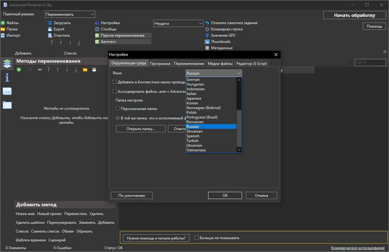 Кроме того с помощью Advanced Renamer вы можете изменить имена музыкальных файлов, с помощью встроенных ID3 функций. Внимание! Для получения возможности выбора русского интерфейса следует