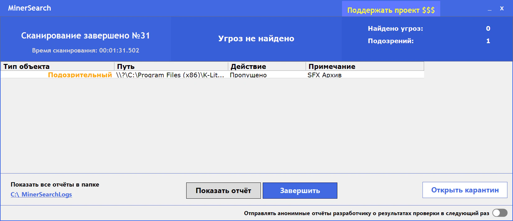 Настоящая программа разработанная для поиска и уничтожения скрытых майнеров. Является вспомогательным инструментом для поиска подозрительных файлов, каталогов, процессов и тд. и НЕ является антивирусом.