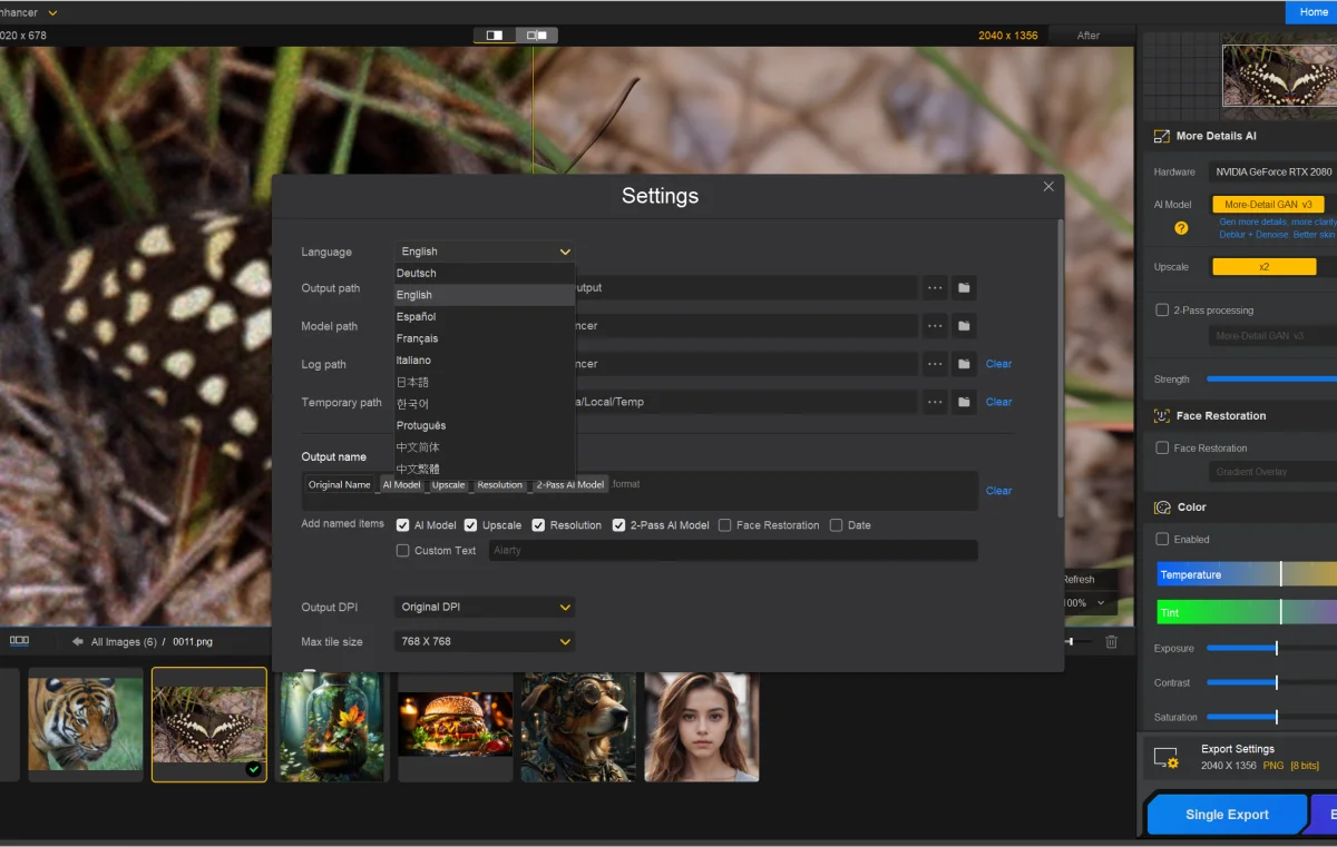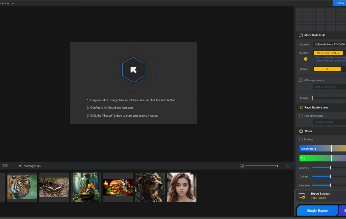 • Автоматизированный процесс: загрузите изображение, выберите модель и масштабирование, экспортируйте результат