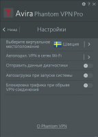 С другой стороны, приложение не предлагает расширенную функциональность, например, встроенный блокировщик рекламы или функцию сжатия данных. Тем не менее, Avira Phantom VPN поддерживает надежное 256-битное сквозное шифрование.В меню настроек пользователь может беспроблемно изменить страну VPN сервера и настроить передачу диагностических данных в Avira.
