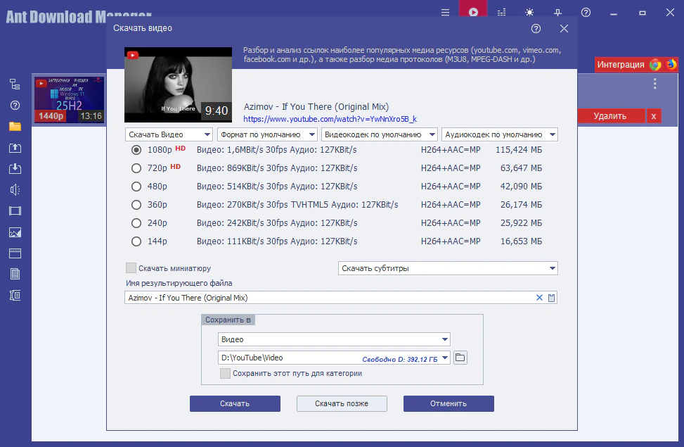 Некоторые наиболее развитые и популярные видео сервисы (например, youtube.com, vimeo.com, dailymotion.com и др.) или медиа протоколы (например, F4M, M3U8, MPEG-DASH и др) предлагают выбор формата, качества и разрешения для загрузки видеофайла. AntDM умеет распознавать такие форматы и предлагает на выбор к загрузке.