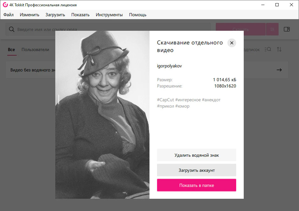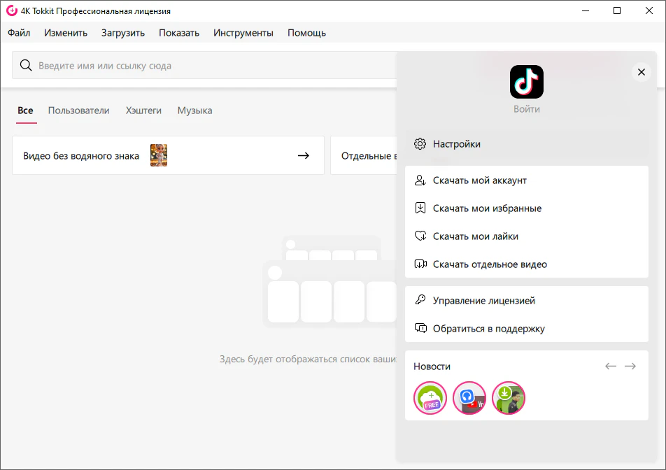 Описание:4K Tokkit — это приложение для массового скачивания контента из TikTok. Сохраняйте TikTok-челленджи, описания видео, целые аккаунты и хэштеги, а также отдельные клипы в высоком качестве. Смотрите TikTok-видео оффлайн, просматривайте ленту TikTok без рекламы, репостите ролики в другие социальные сети.