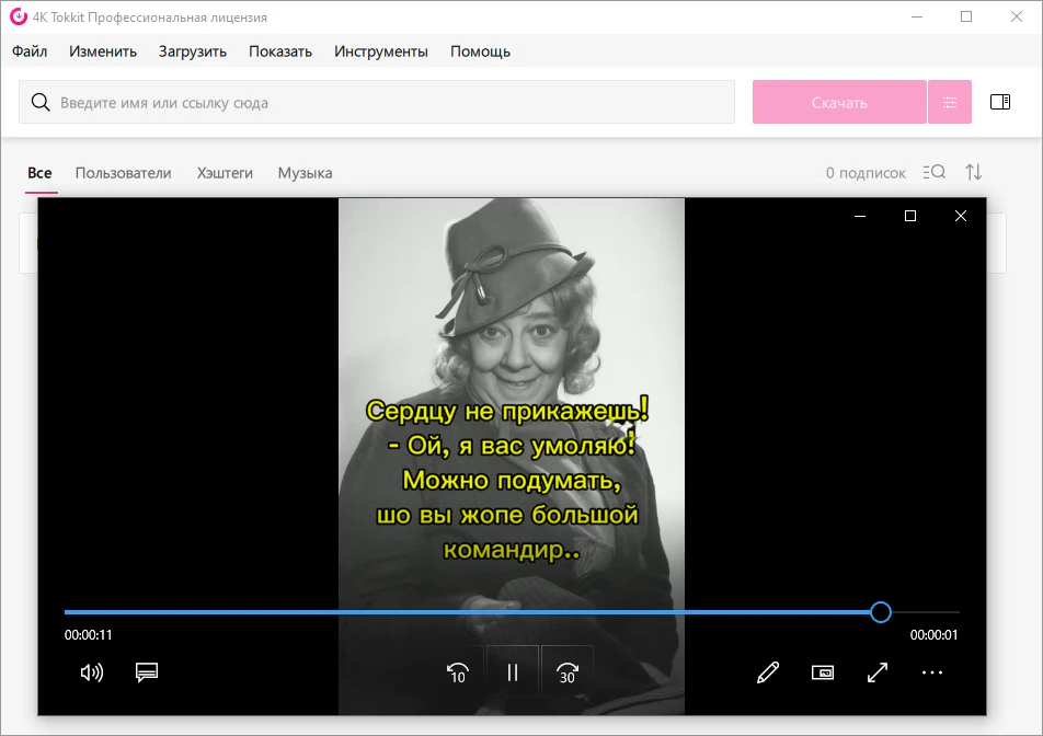 - Скачайте видео из TikTok с оригинальными субтитрами. Наведите курсор на значок видео, чтобы увидеть заголовок в приложении и скопируйте его в буфер обмена.