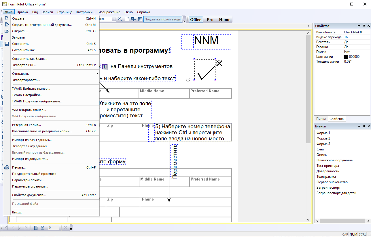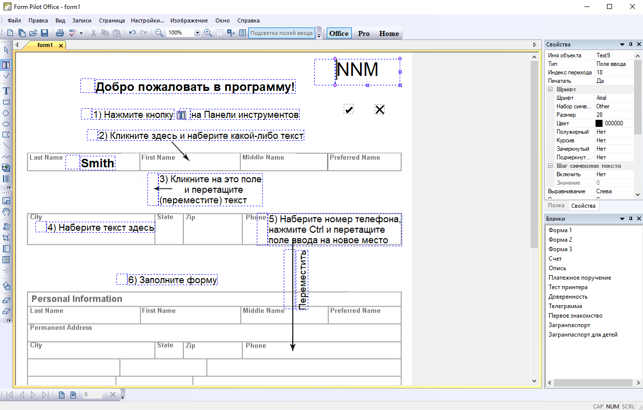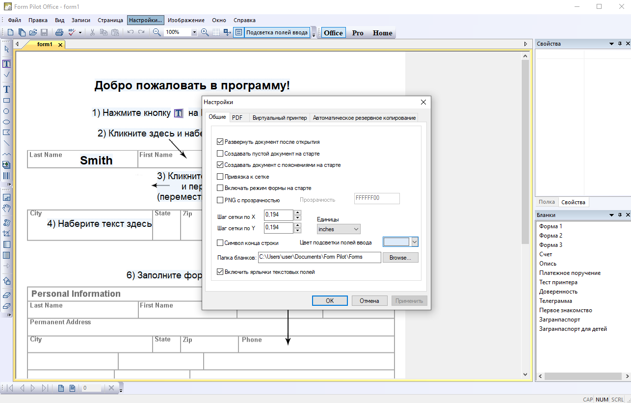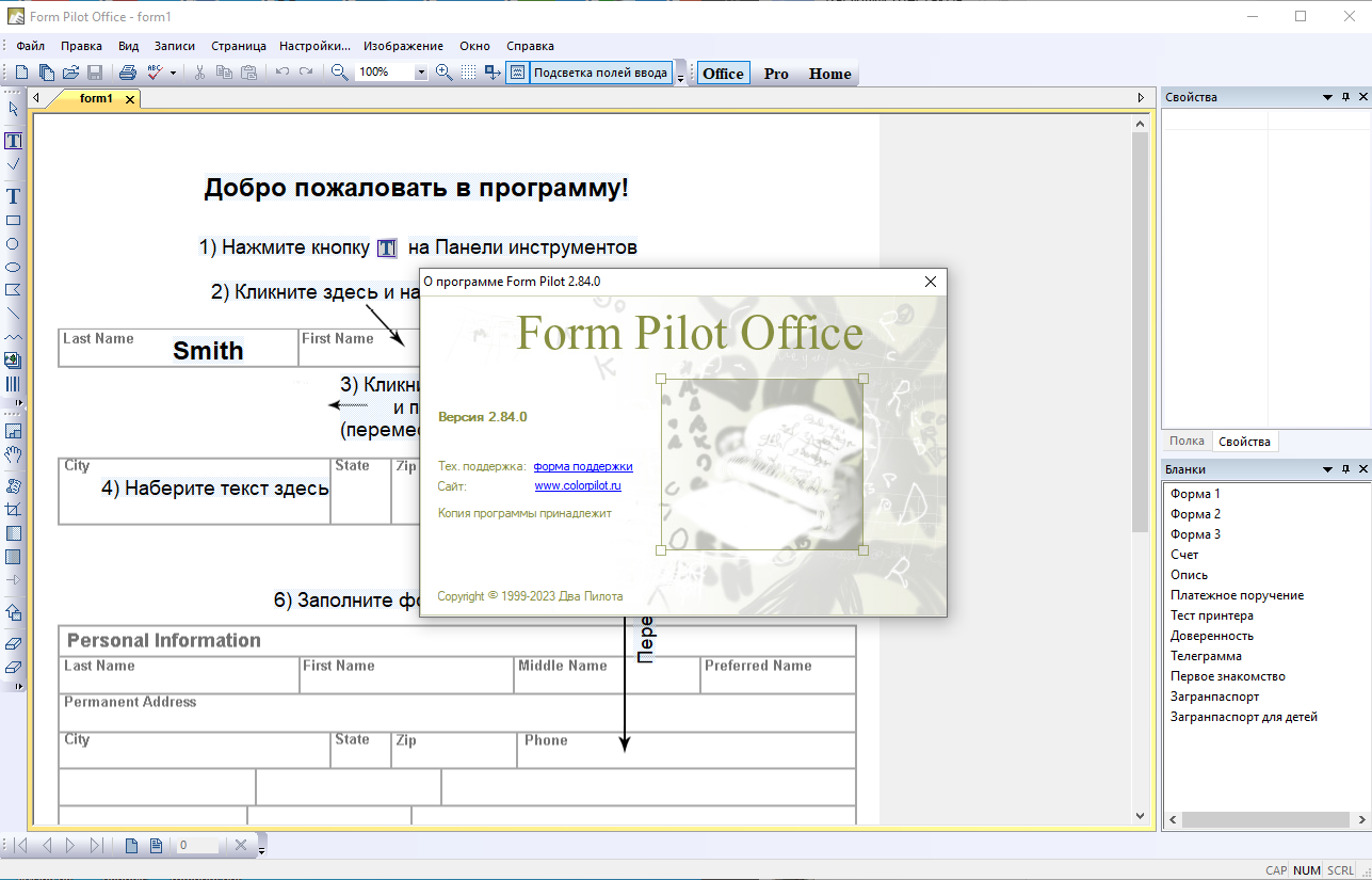 Windows XP / Vista / 7 / 8 / 8.1 / 10 / 11 (32-бит и 64-бит) Описание:Form Pilot Office — программа для заполнения электронных форм различных типов (PDF, DOC, XLS, TXT и т.д.) и бумажных бланков. Позволяет экспортировать и импортировать данные в программу из внешней БД, сохранять документы в формате PDF, редактировать, распечатывать, посылать их по факсу и e-mal. В программе Form Pilot Office есть возможность вести базу данных. Получив заполненные бланки обратно, сохраните информацию из них в документе, специально выделенном для сбора данных. Подготовка форм для клиентов и сбор информации в базу данных. Допустим, клиенту вашей компании требуется заполнить форму, переслать ее вам, а копию сохранить у себя. Acrobat Reader не позволяет пользователю сохранить изменения в форме. Form Pilot Office поможет решить данную задачу.