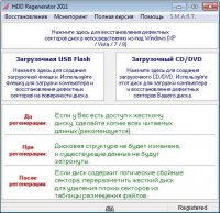 Описание: HDD Regenerator — программа для восстановления жестких дисков. Умеет восстанавливать плохие сектора (не скрывать их, а именно восстанавливать — так сказано на сайте). Принцип работы — применение специального алгоритма перемагничивания нечитаемого сектора, позволяющего во многих случаях восстановить его. Для этого используется специальная загрузочный диск / флешка, создающаяся после запуска программы.