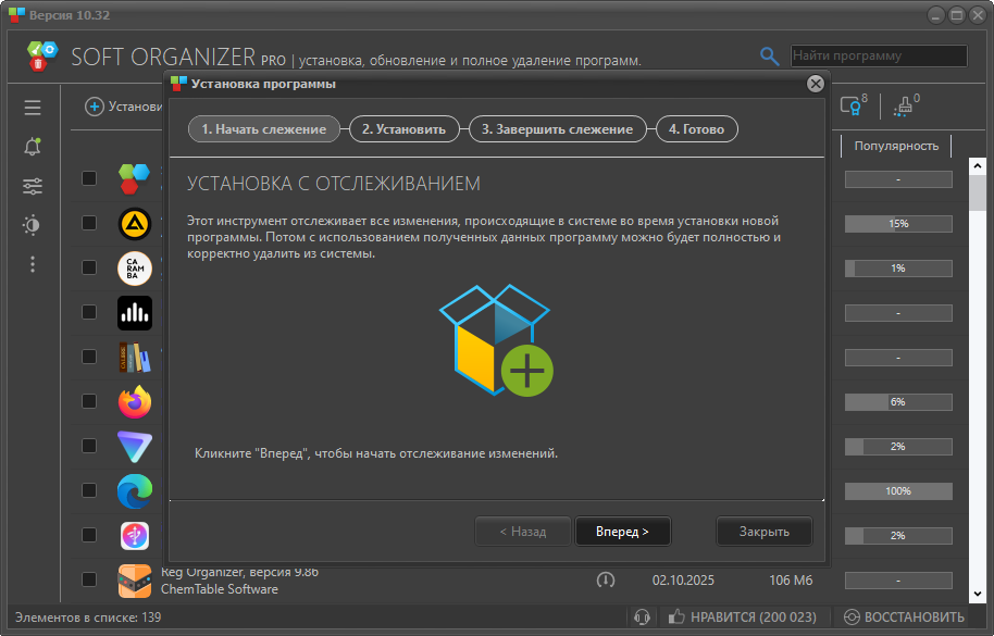 - Основной возможностью программы является полное удаление программ из системы. Для этого Soft Organizer отслеживает все изменения, которые происходят в системе во время установки интересующего приложения. Вы можете узнать, какие файлы и записи реестра были созданы или изменены. Используя эти данные, Soft Organizer полностью удалит программу из системы при необходимости.