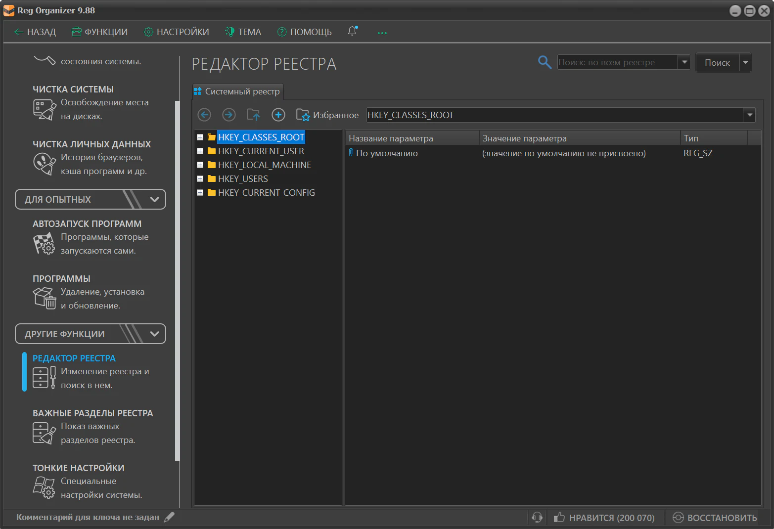 - Продвинутый редактор реестра Reg Organizer позволяет производить различные операции с системным реестром, в том числе экспортировать, импортировать, копировать значения ключей и многое другое. В отличие от встроенного в Windows, редактор реестра в Reg Organizer более функционален.