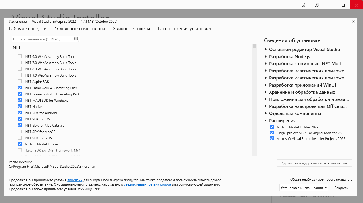 -Для установки Visual Studio требуется .NET Framework 4.7.2 или более поздняя версия . (Для установки Visual Studio версии 17.8 и более ранних версий требуется .NET Framework 4.5.2 или более поздняя версия.) Для работы Visual Studio требуется .NET Framework 4.8. Если .NET Framework 4.8 ещё не установлен, он будет установлен во время установки.