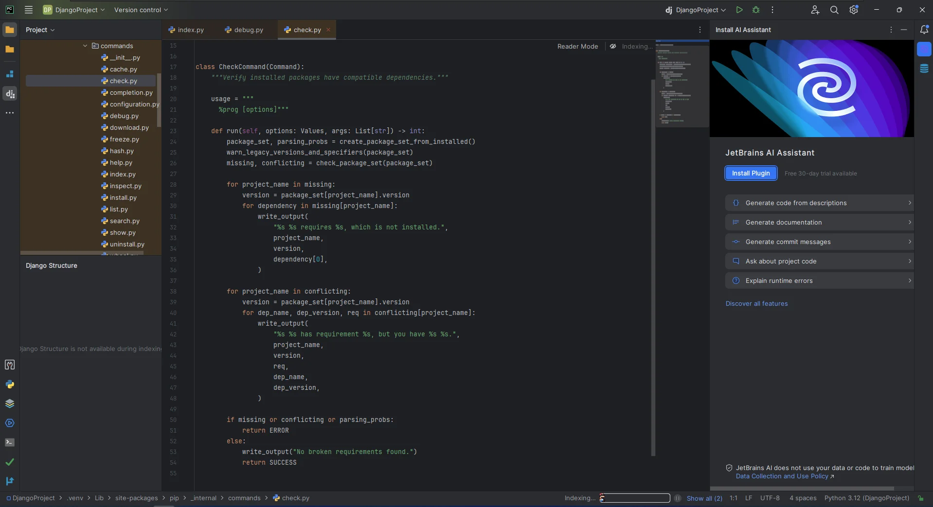 • Помощь при написании кода, включающая в себя автодополнение, авто-импорт, шаблоны кода, проверка на совместимость версии интерпретатора языка, и многое другое.